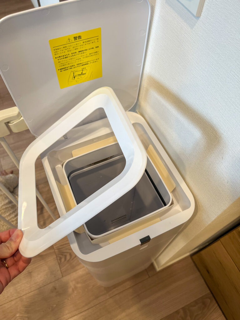 で終了すると「ポンッ」と中に密閉されたゴミ袋が置いてある状態になるので、それを持ち上げて捨てるだけ。